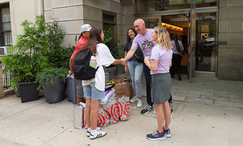 我们的迎新领队(Orientation Leaders)和宿舍助理(Resident Assistants)会协助卸车、引导学生前往签到处,并解答家长的各种问题。今年,请注意那些穿着紫色 T 恤的人,他们非常显眼,随时可以为你提供帮助!